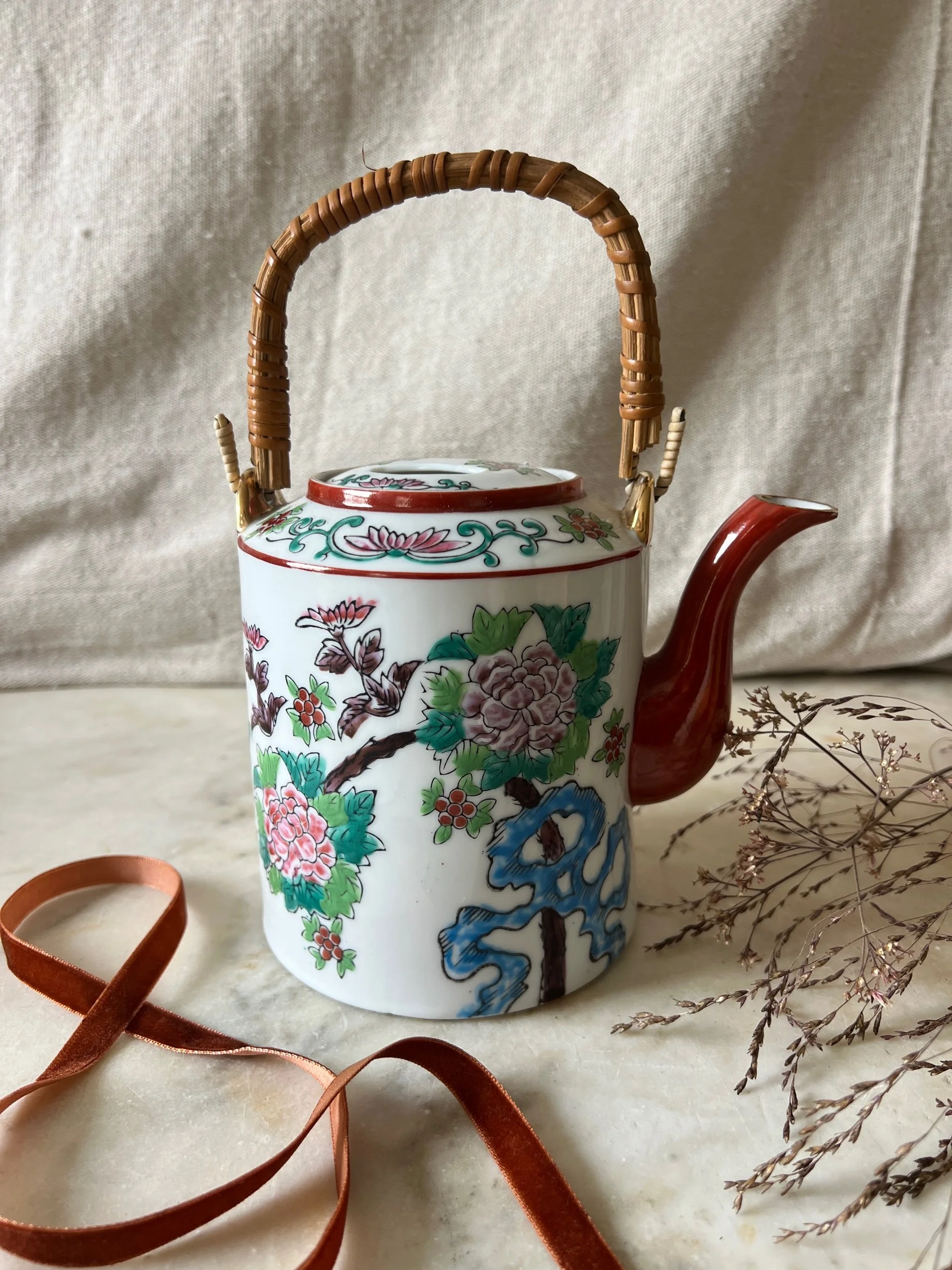 Adorned with intricate hand-painted designs inspired by traditional Chinese motifs, the teapot's vibrant colors and patterns create a visually striking piece. The rattan handle adds a natural, rustic touch, complementing the teapot's elegant curved spout. Crafted with meticulous attention to detail, this teapot not only serves as a functional vessel for brewing tea but also serves as a stunning decorative accent, seamlessly integrating into a variety of interior styles.