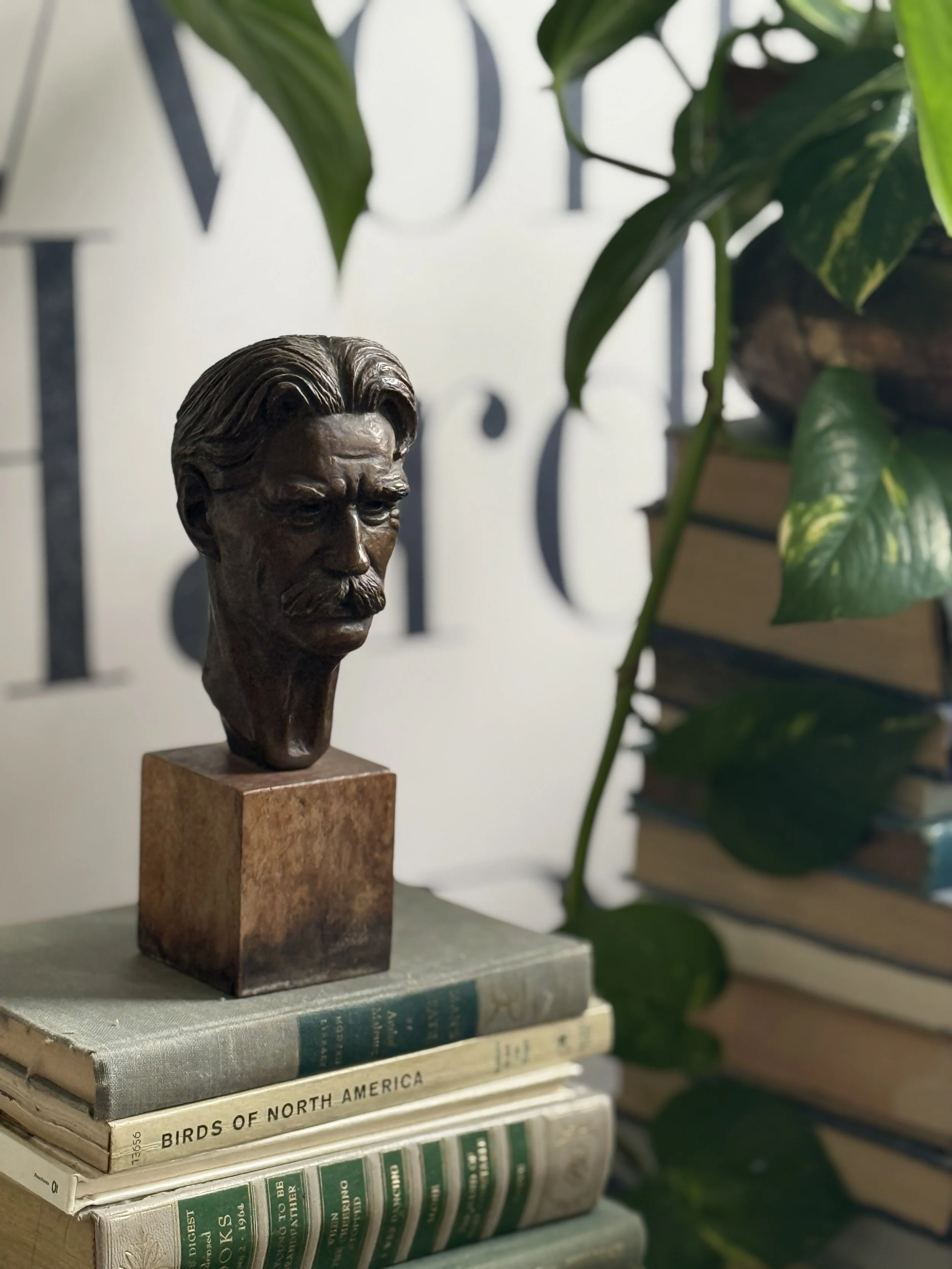 A remarkable piece of mid-century American history — this is an original 1955 Albert Schweitzer bust by Leo Cherne, signed and dated on the neck ©1955 Leo Cherne. Cast in a rich bronze-finish patina on a solid wood plinth, this is an exceptional find for collectors of American sculpture, presidential-era art, or vintage intellectual décor.