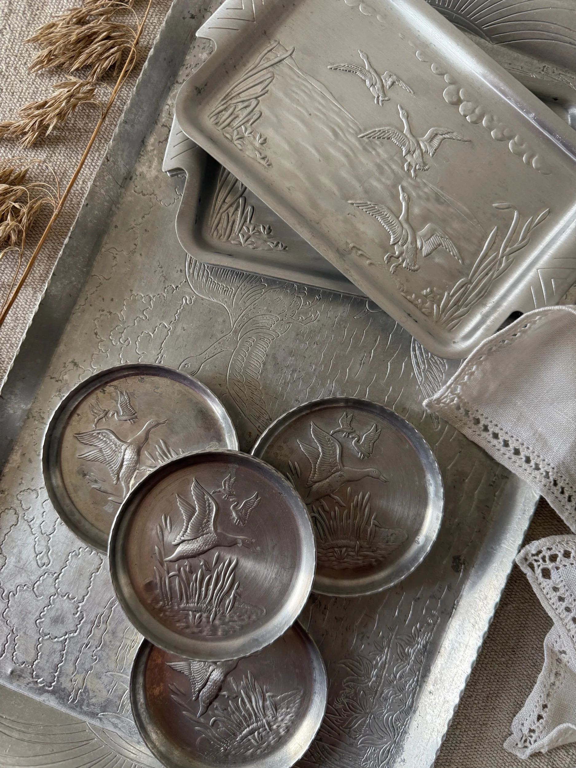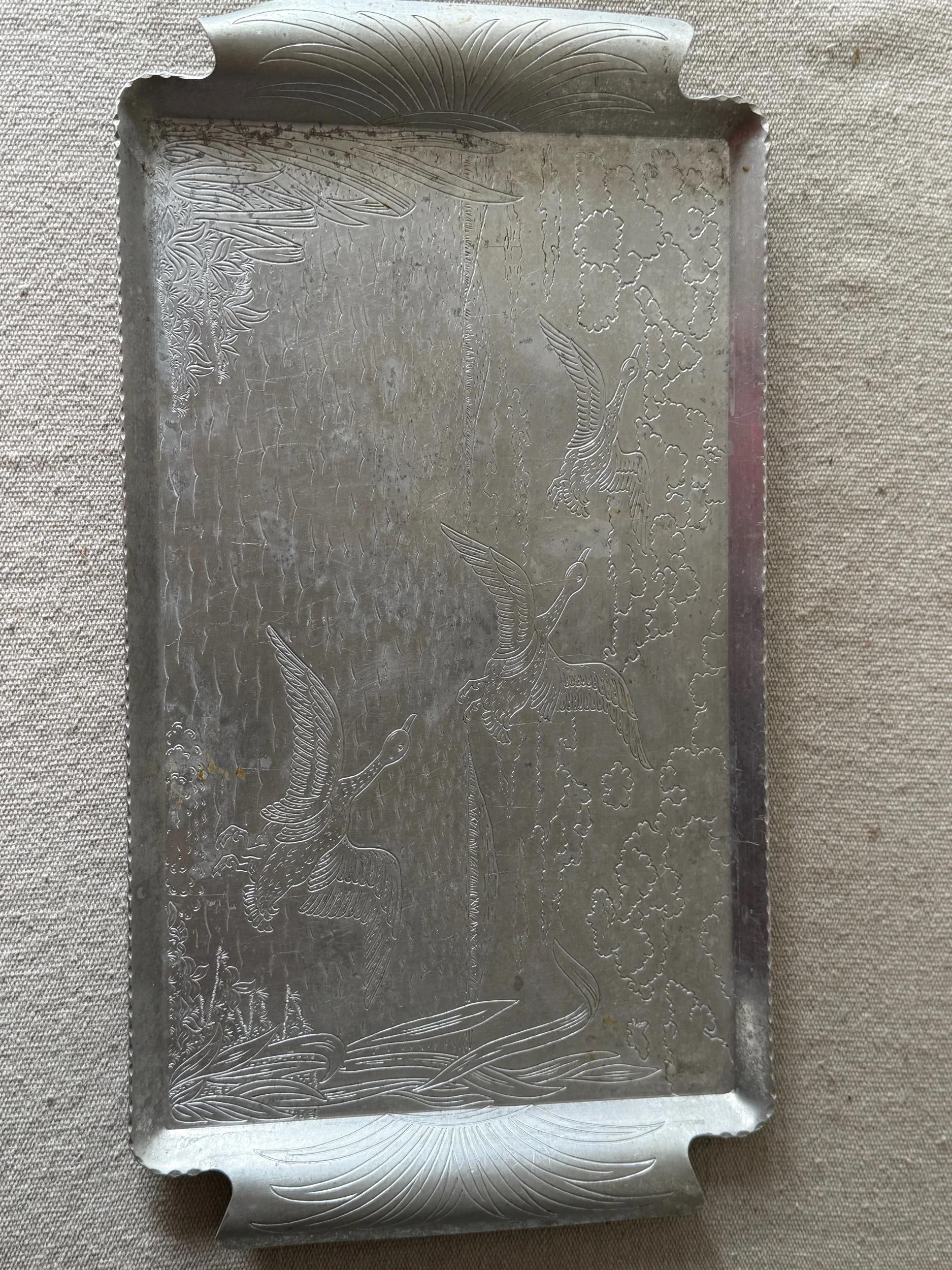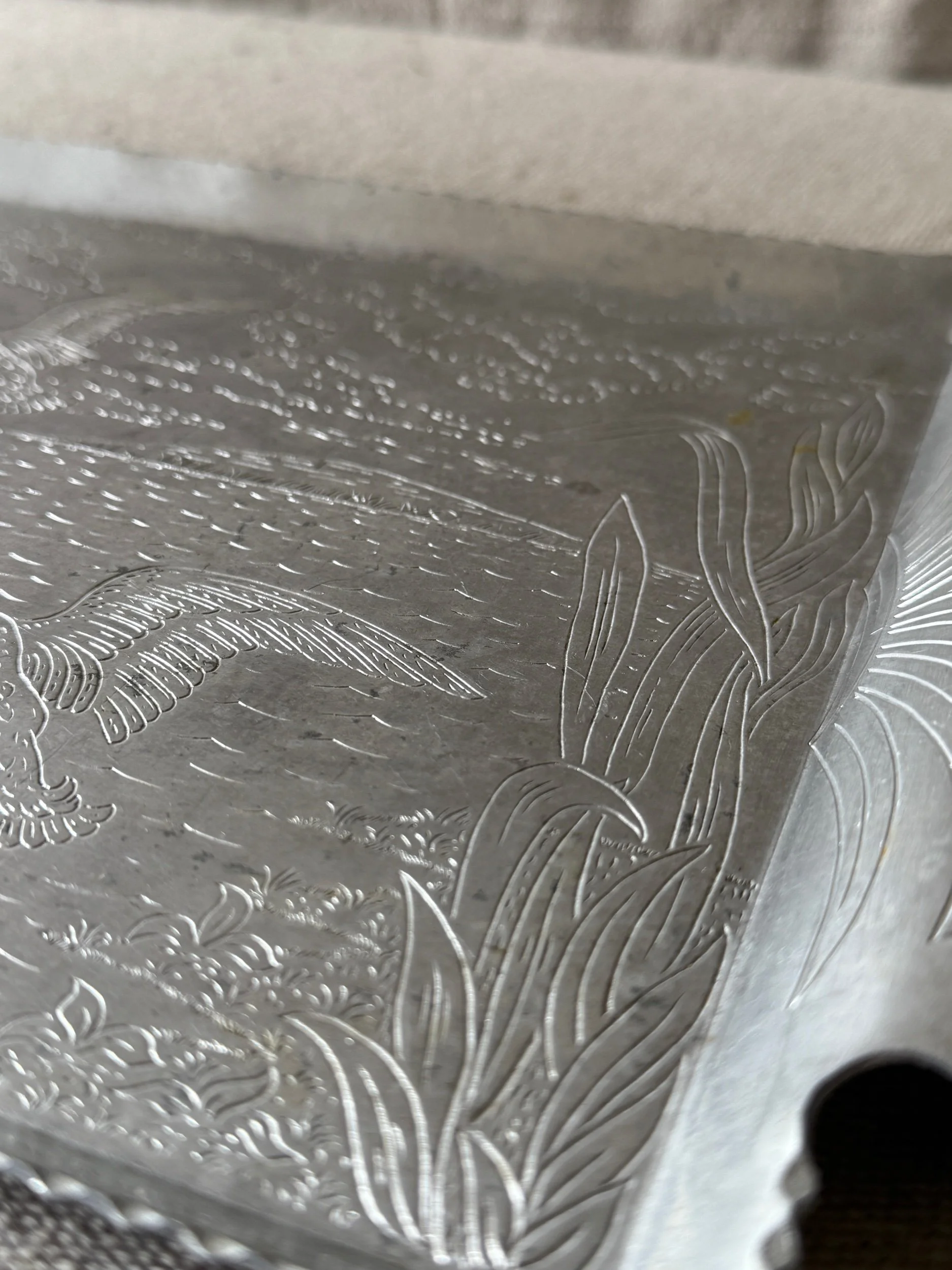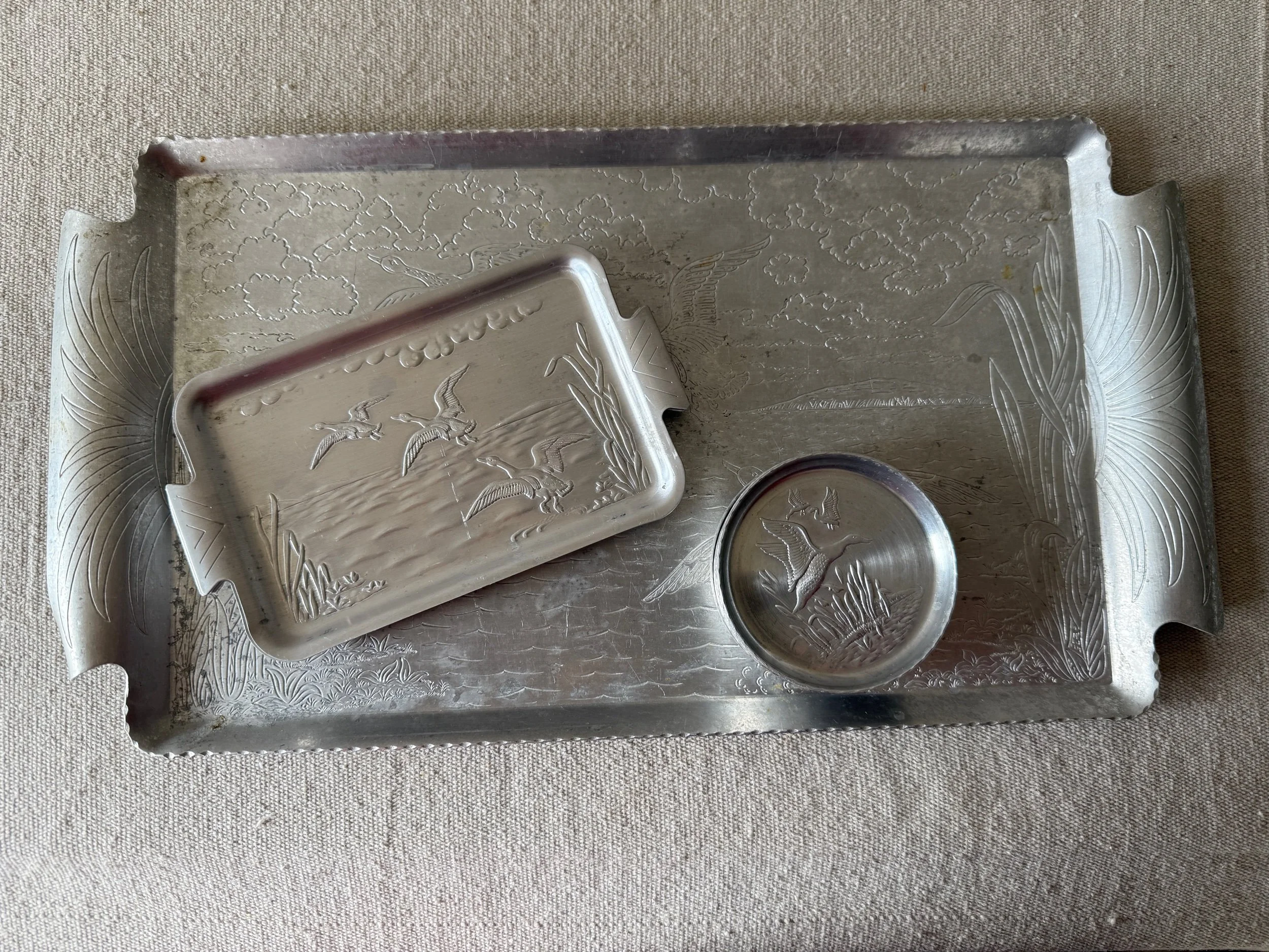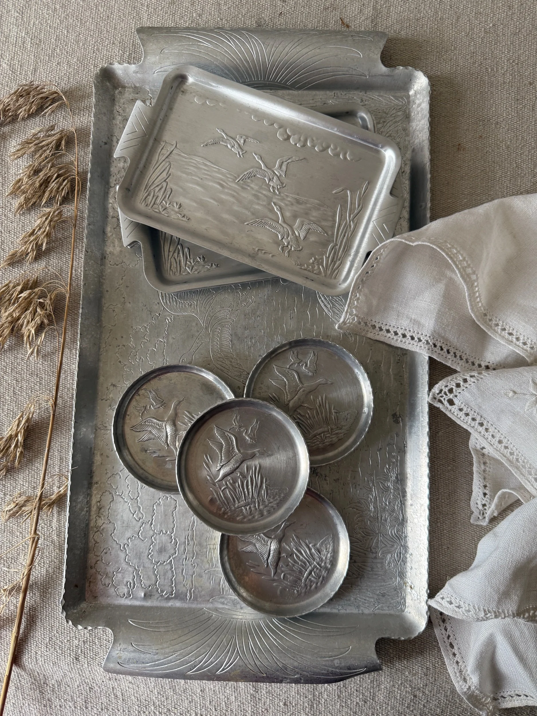 Vintage Etched Aluminum Serving Set with Flying Bird Motif