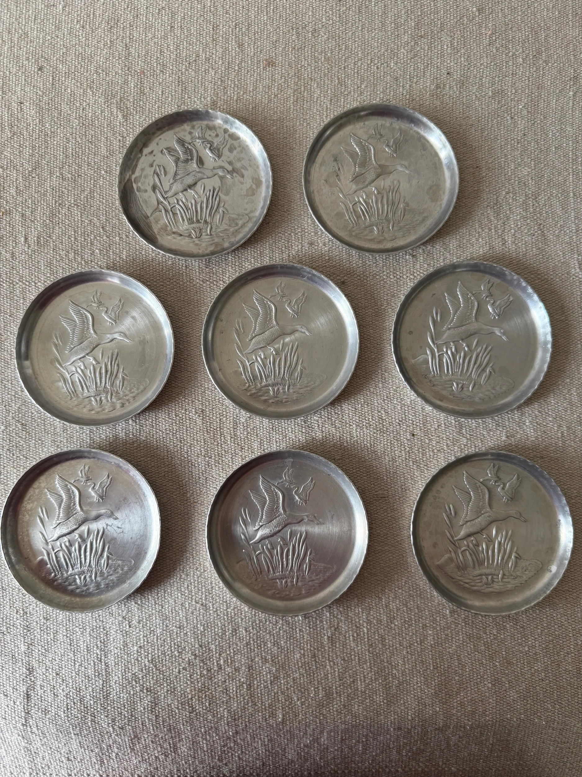 A beautifully coordinated vintage etched aluminum serving set, rich with movement and classic charm. Featuring an elegant flying bird motif with softly textured landscapes, this set evokes mid-century outdoor entertaining and timeless hospitality.