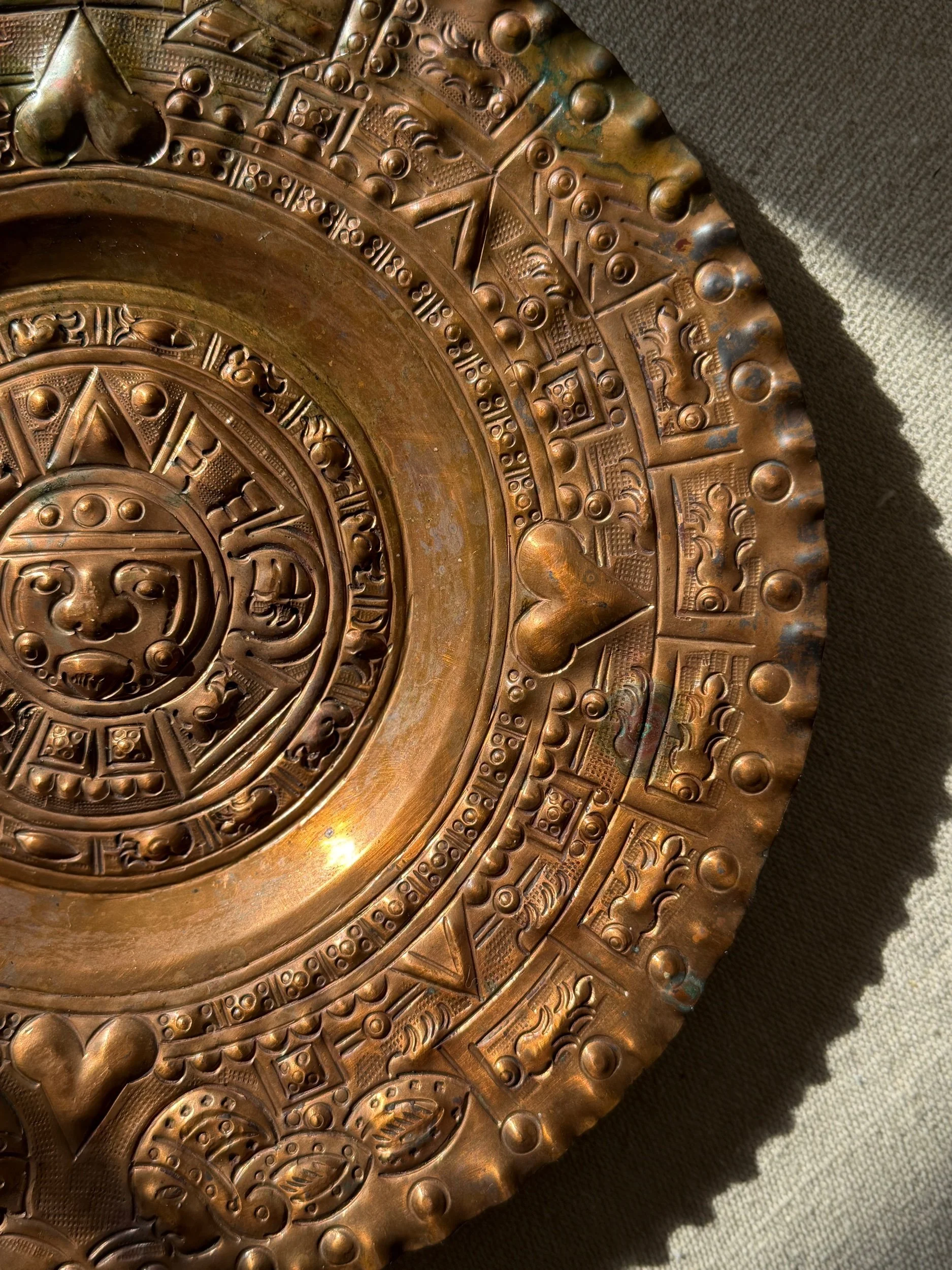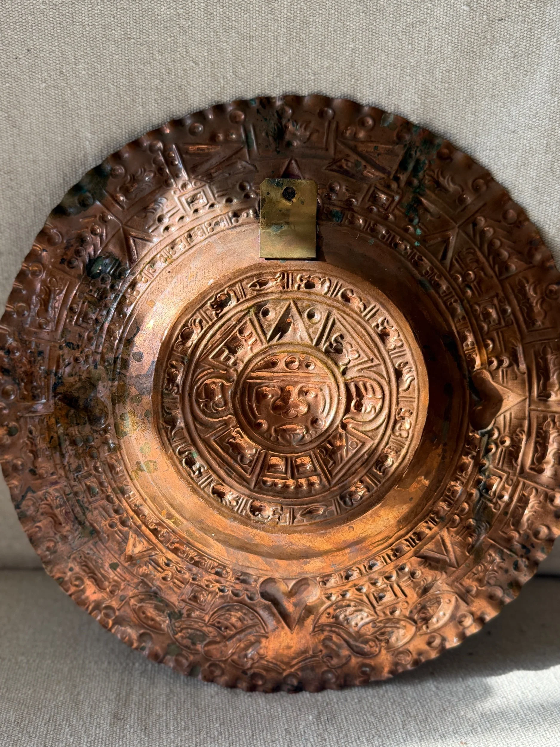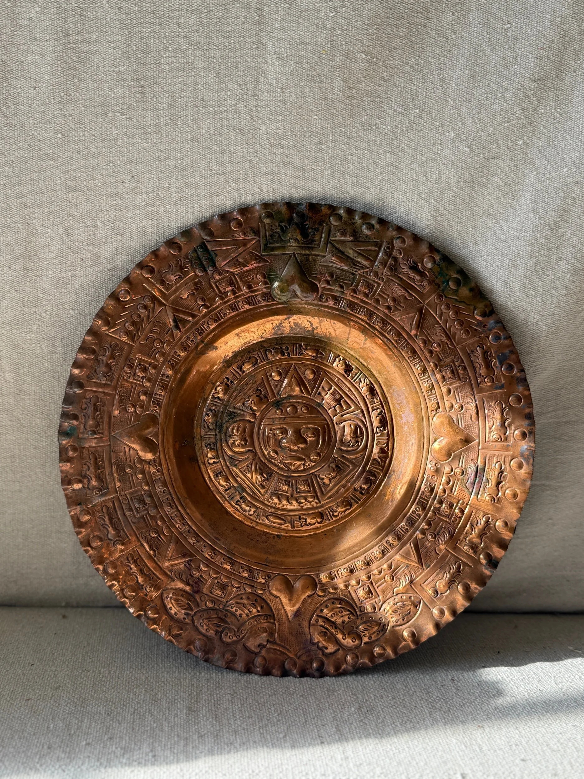 Vintage Solid Copper Wall Plate – 12” Handcrafted Aztec Calendar Sun Stone Design – Rustic Global Wall Decor