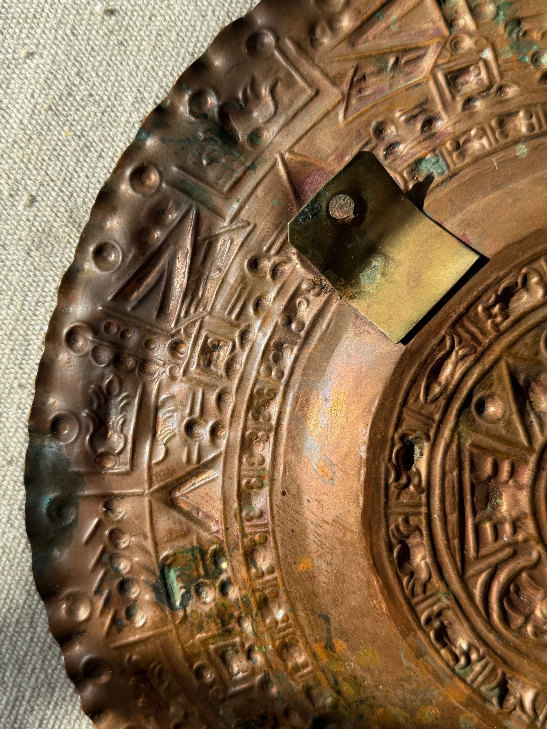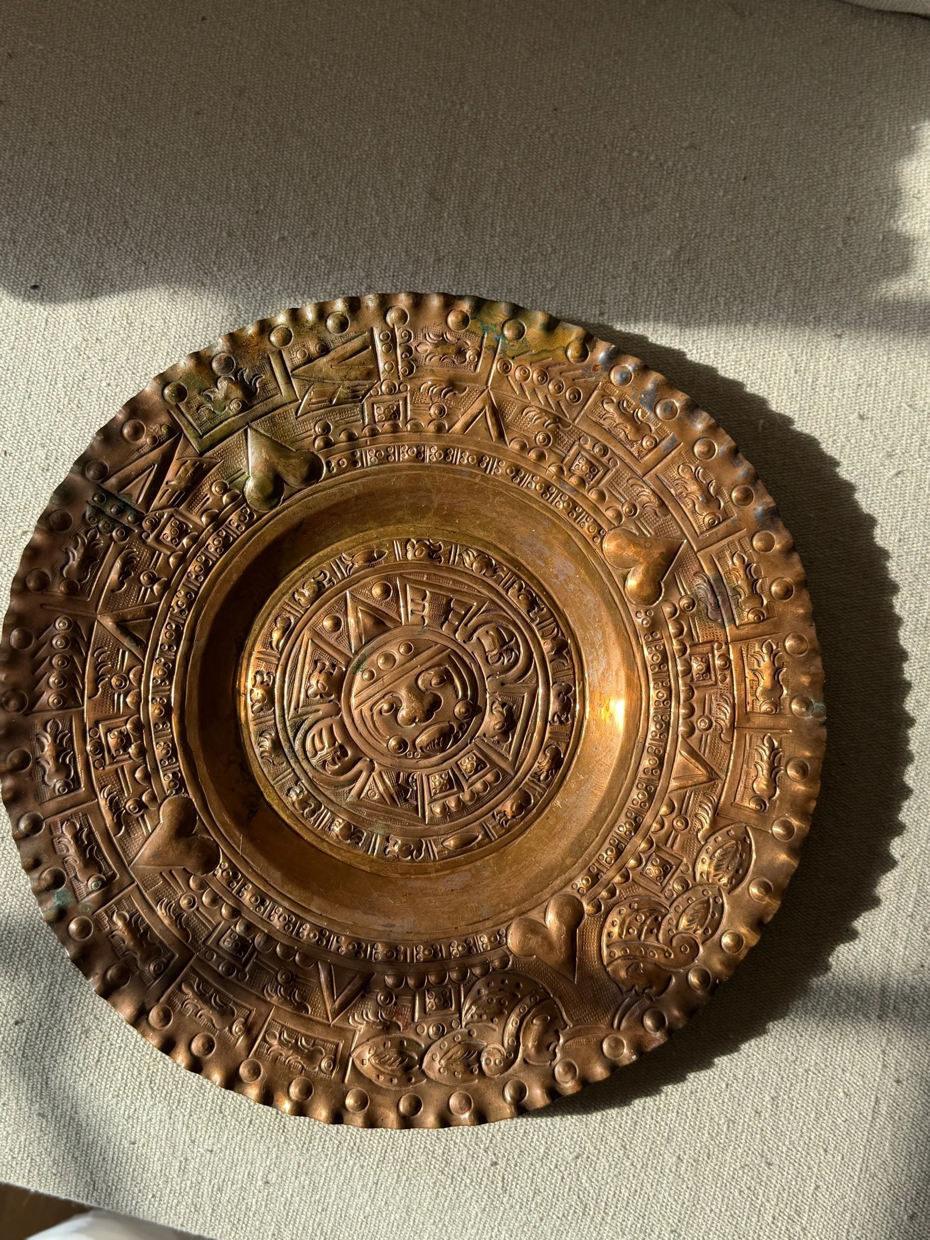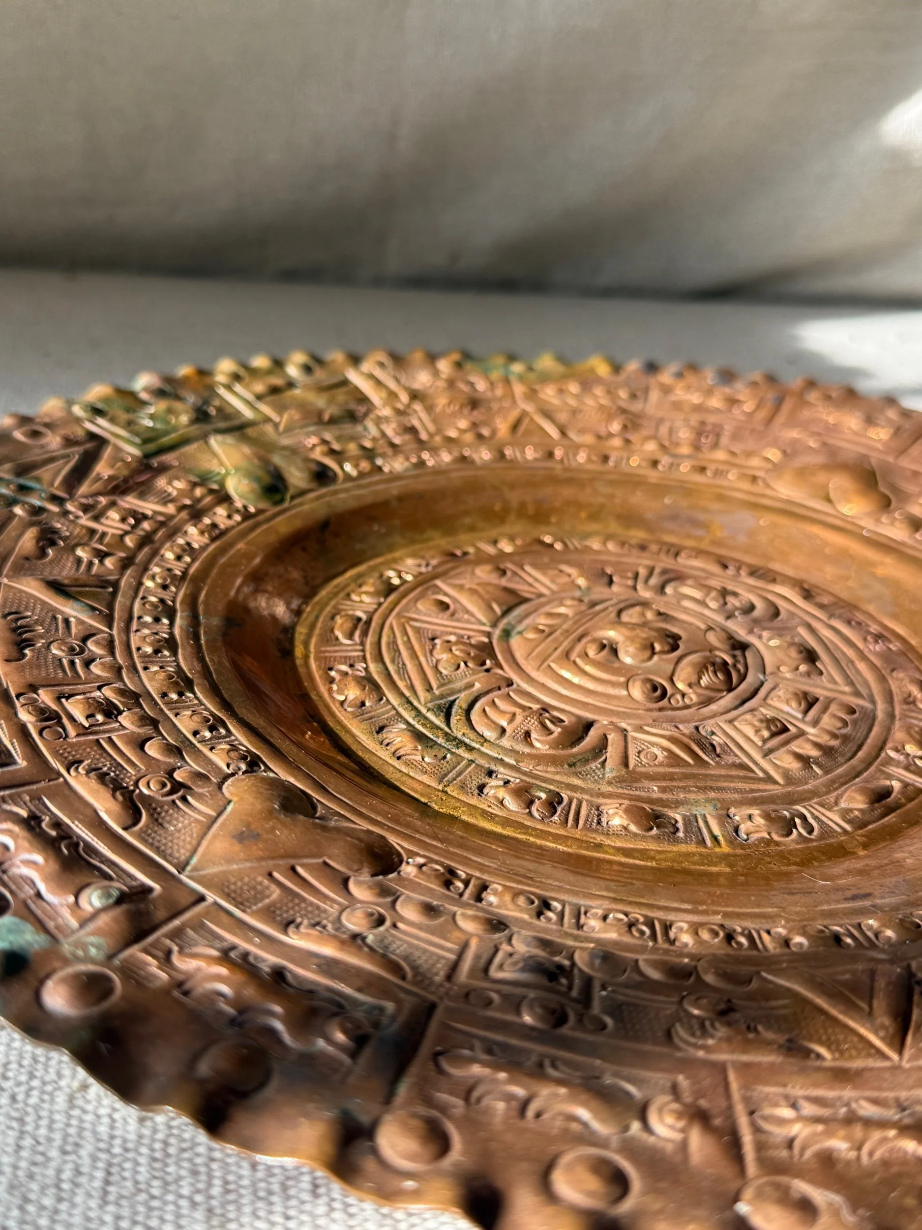 Vintage Solid Copper Wall Plate – 12” Handcrafted Aztec Calendar Sun Stone Design – Rustic Global Wall Decor