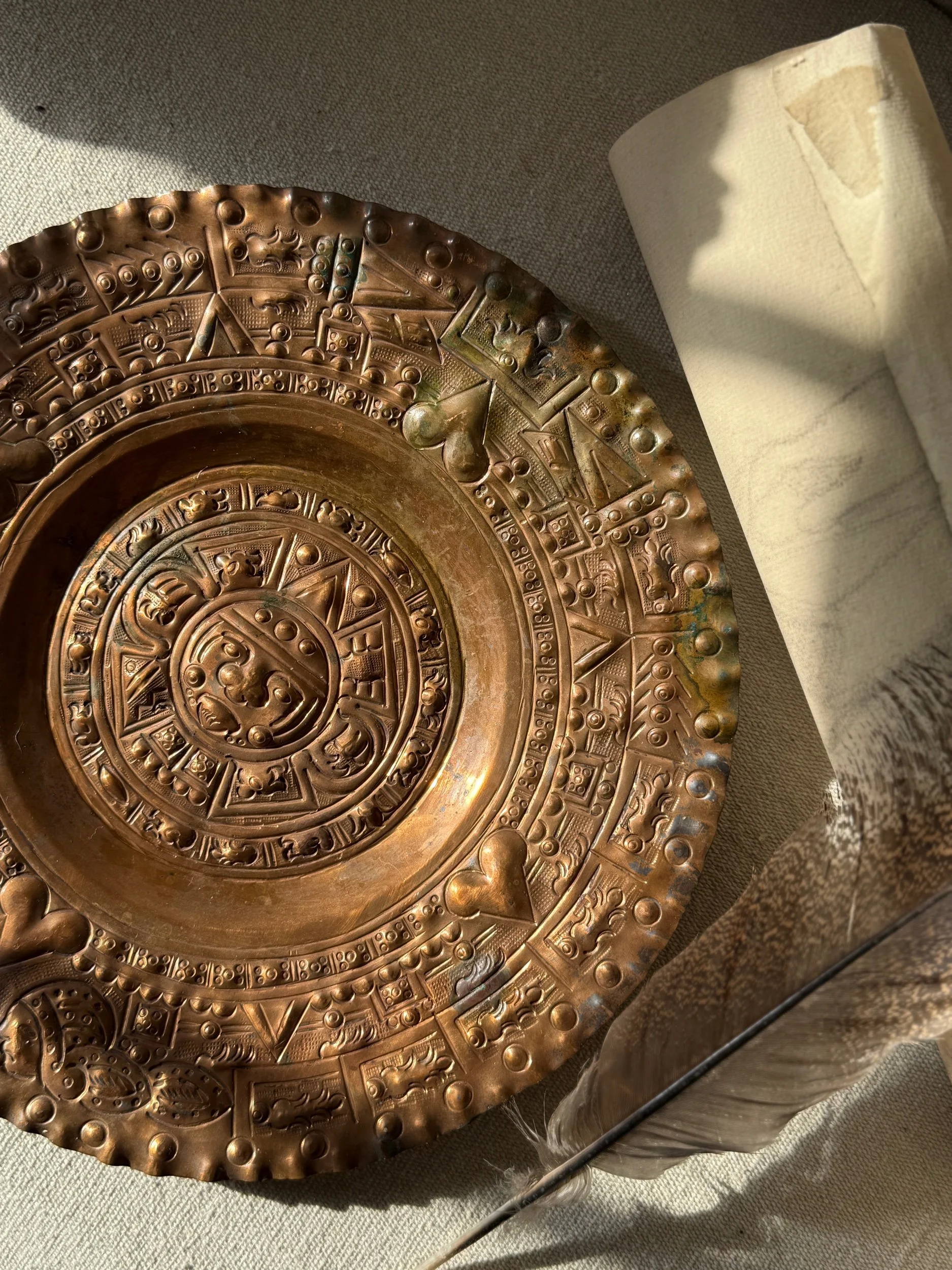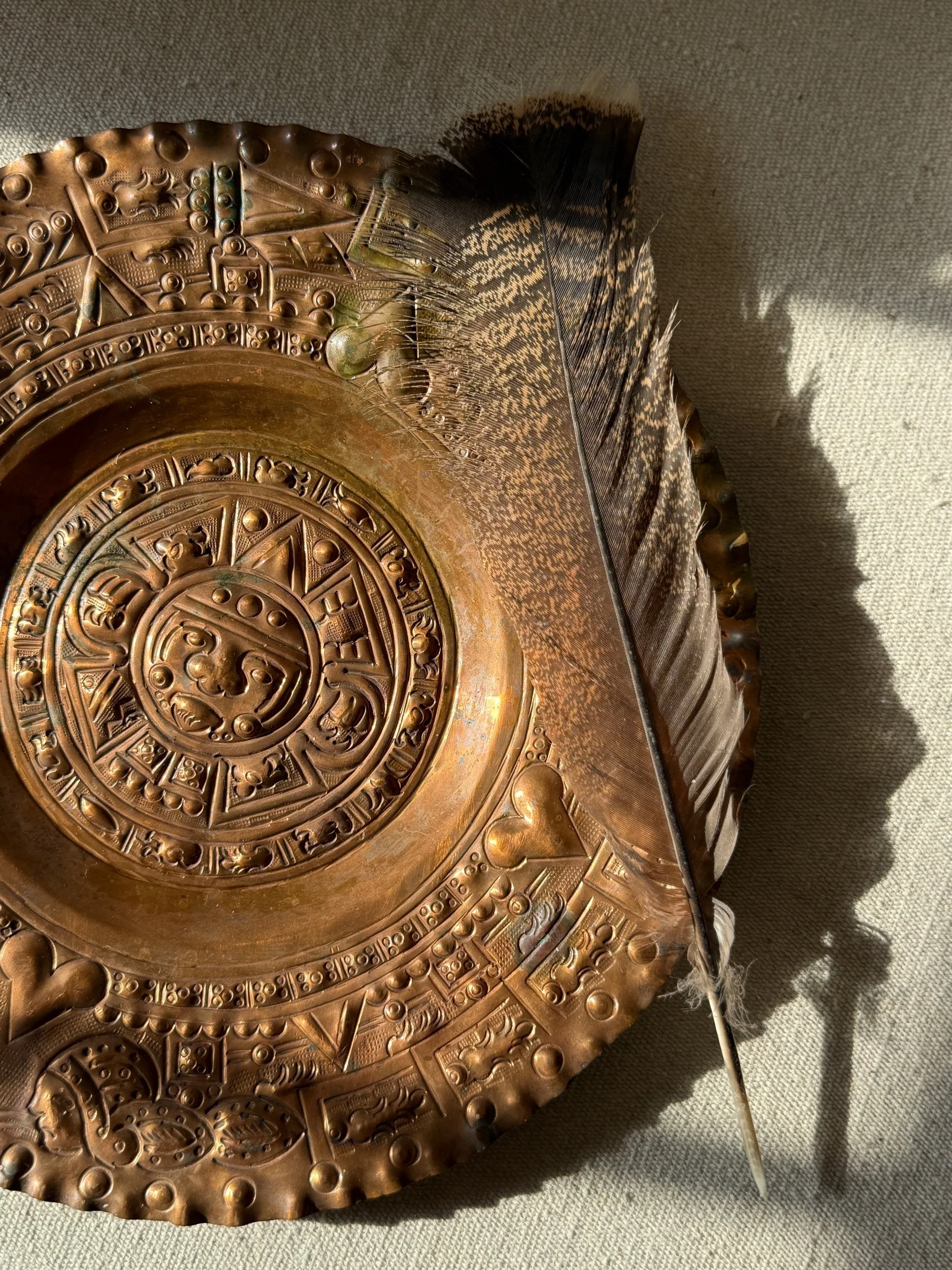 There is a timeless beauty in pieces that carry the spirit of history and craftsmanship. This vintage solid copper wall plate, measuring a striking 12 inches, is embossed with the intricate artistry of the Aztec calendar sun stone—a motif rich with culture, heritage, and symbolism.