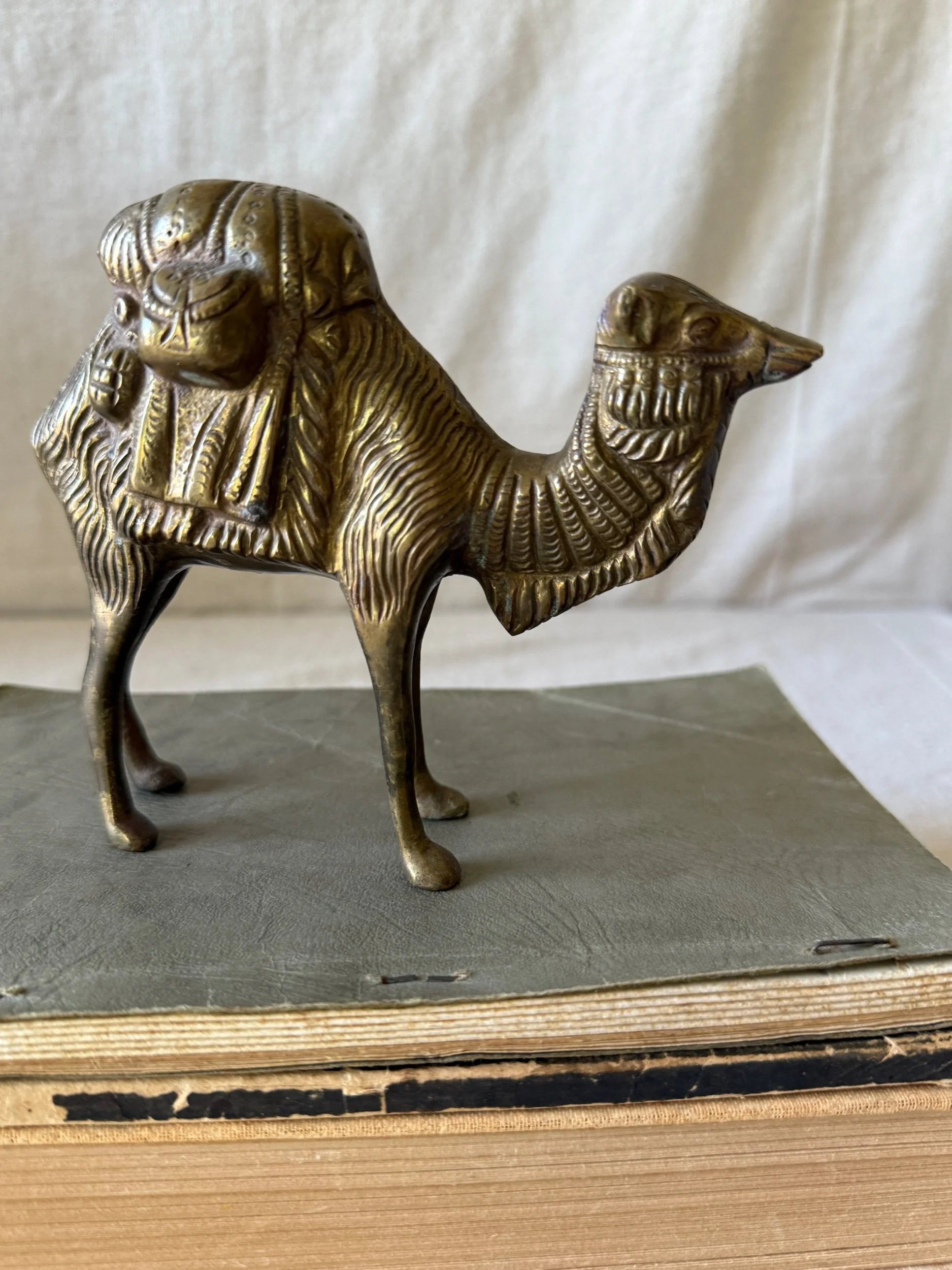 Whether displayed on a bookshelf, desk, or atop a stack of vintage books, this camel evokes the romantic imagery of desert caravans and faraway lands. Its weight and intricate detailing make it a striking accent for interiors styled in heritage, Old World explorer, or eclectic academic Americana aesthetics.